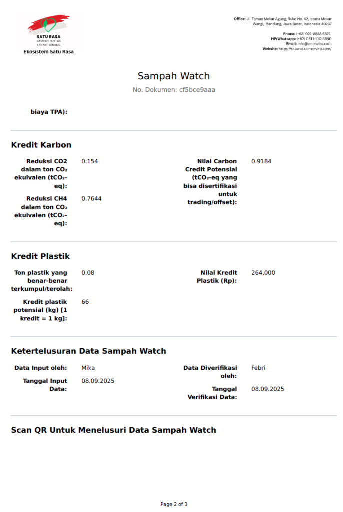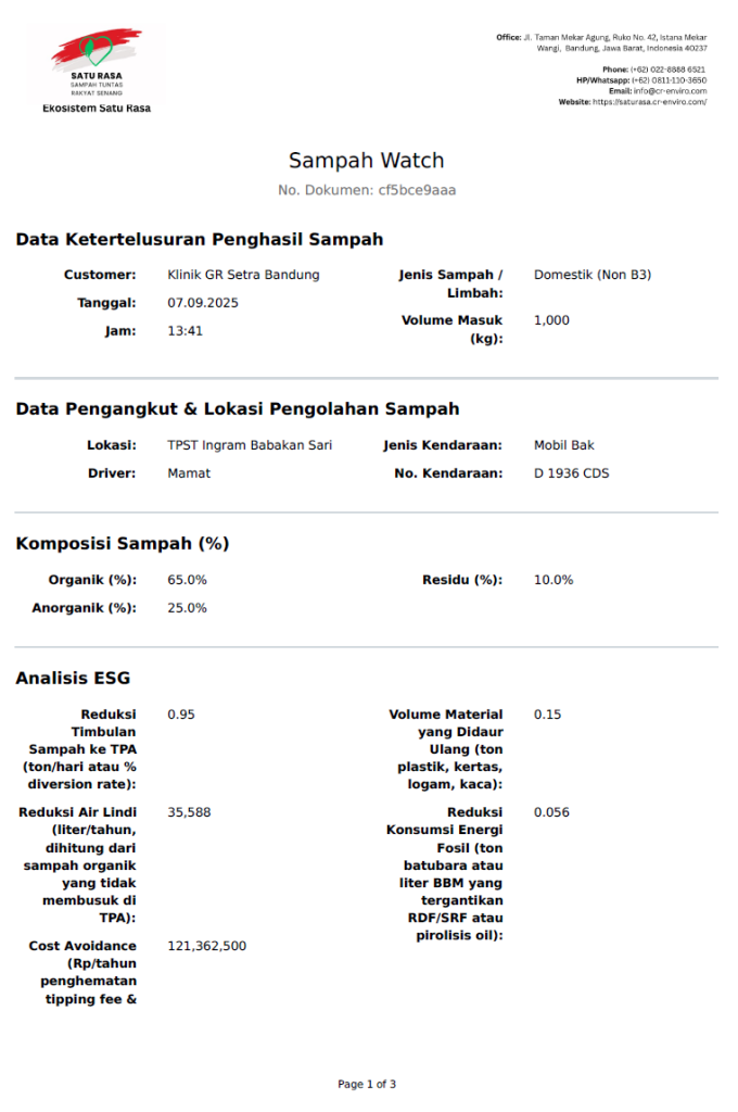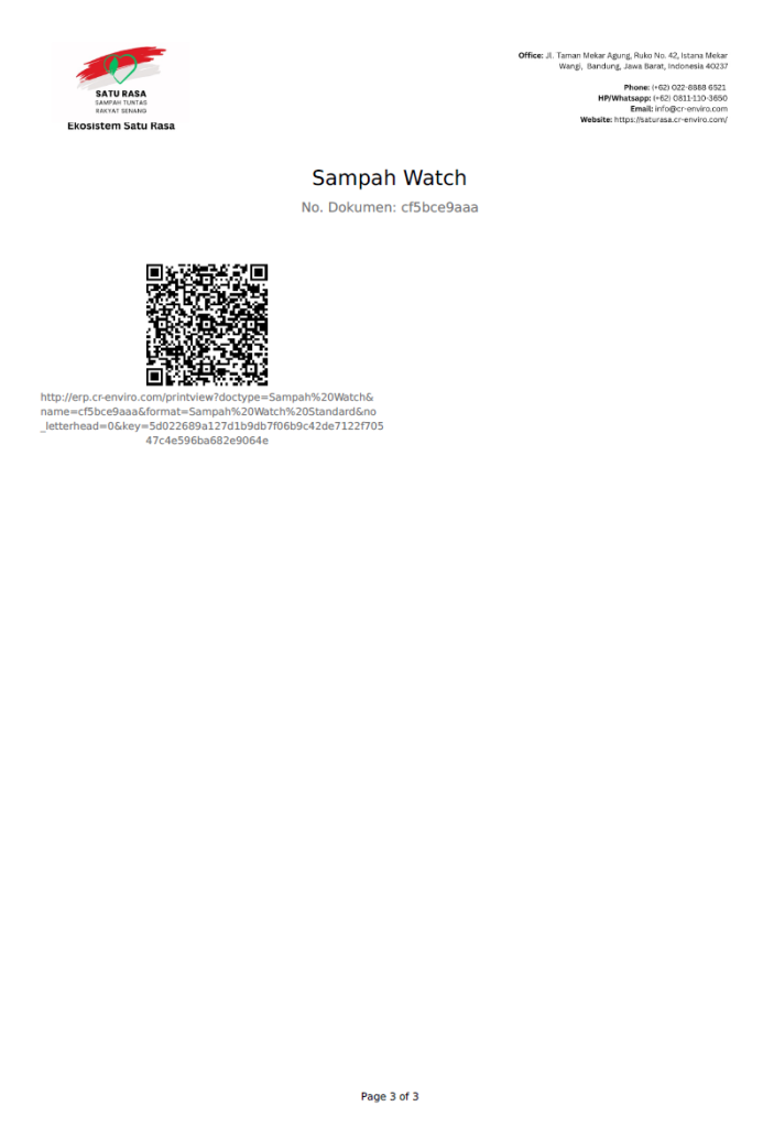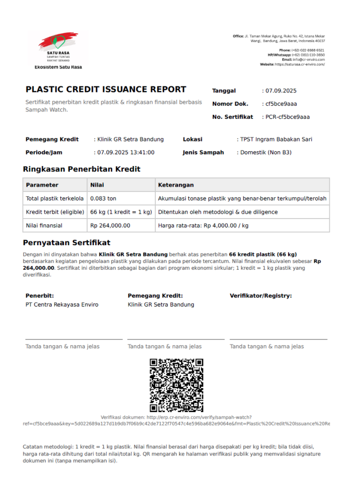 - Ketertelusuran Penuh (Traceability): Setiap dokumen dilengkapi QR code dan tautan verifikasi publik melalui ERP (http://erp.cr-enviro.com/verify/...).