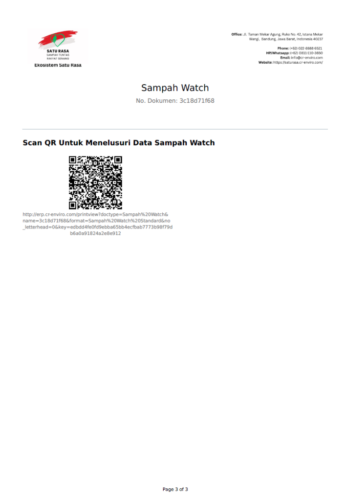 Setiap sertifikat dan laporan dari Sampah Watch dilengkapi QR code unik yang bisa dipindai untuk mengakses halaman verifikasi publik di ERP. Hal ini memastikan keaslian dokumen dan kredibilitas data yang digunakan dalam pelaporan. Silahkan scan contoh dokumen dibawah ini: