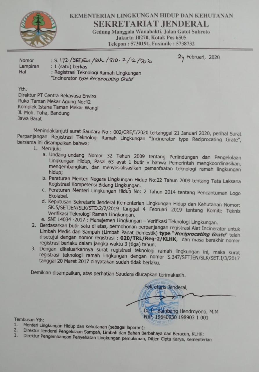 Registrasi Teknologi Ramah Lingkungan (TRL) PT Centra Rekayasa Enviro